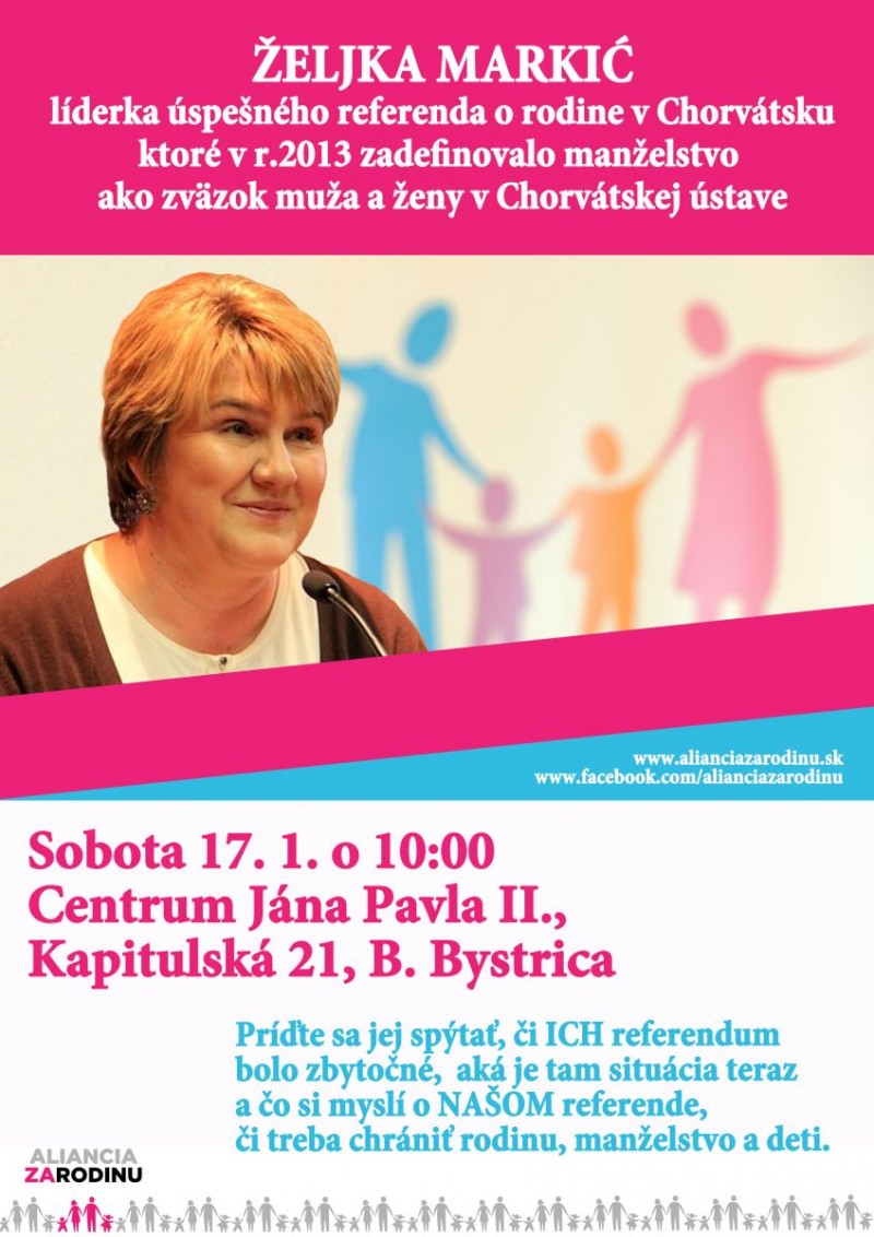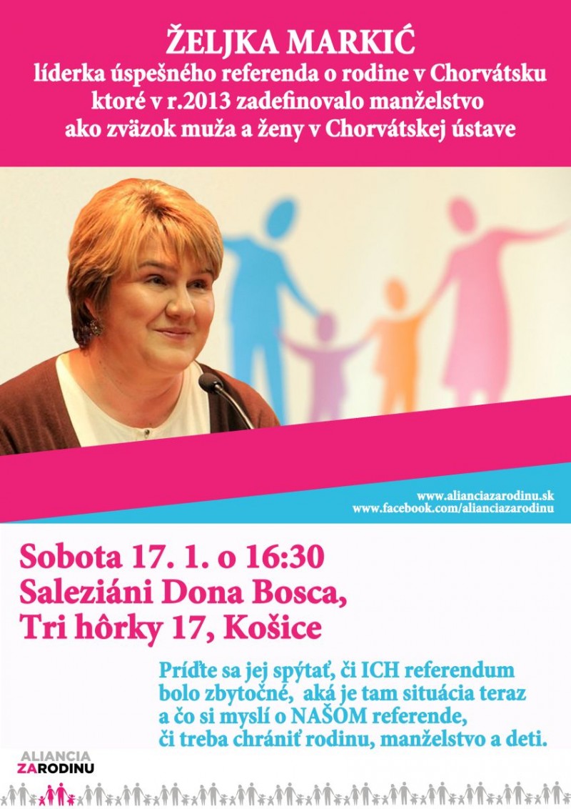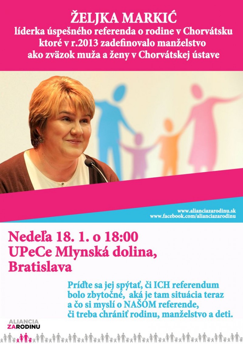 Líderka úspešného referenda o rodine v Chorvátsku, ktoré na jeseň 2013 zadefinovalo manželstvo ako zväzok muža a ženy v Chorvátskej ústave, navštívi Slovensko v dňoch 16. - 21. januára 2015 so sériou prednášok a vystúpení k téme ochrany rodiny a referenda.