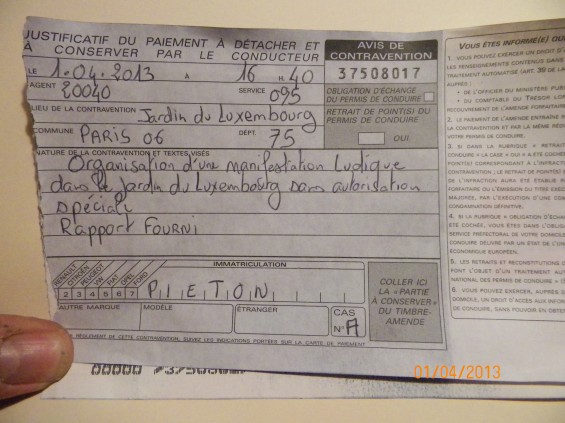 Napriek jeho protestu ho policajti vzali na políciu, aby si celú vec vyjasnili so zodpovedným policajného prezídia. Tam ho hodinu vypočúvali, celú záležitosť uzavreli v čosi, čo možno považovať za nelegálne - čiže za "organizovanie protestov v Luxemburských záhradách bez náležitého povolenia". Parížana napokon prepustili po tom, čo si inkriminovanú bundu vyzliekol. Nasledovať bude administratívny proces a v prípade obvinenia, Franck Talleu zaplatí zatiaľ nešpecifikovanú pokutu.