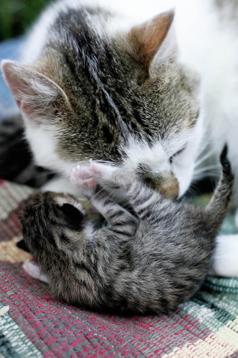 Potom sa o ne mamička mačka príkladne stará. Neustále je s nimi a len v nevyhnutných prípadoch (keď sa musí sama nažrať), ich na chvíľu opustí. Prenáša ich, keď sa odplazia ďalej od ich pelechu. Neskôr im nosí myši, oboznamuje ich s ich pachom. Potom ich špecifickým mraučaním volá na lov a učí ich loviť. Sama vyzerá miestami biedne, vychudnuto a unavene, ale mačiatka teraz majú prednosť. Aj v jej očiach badať zmenený pohľad. Už nie taký hravý, ako predtým.